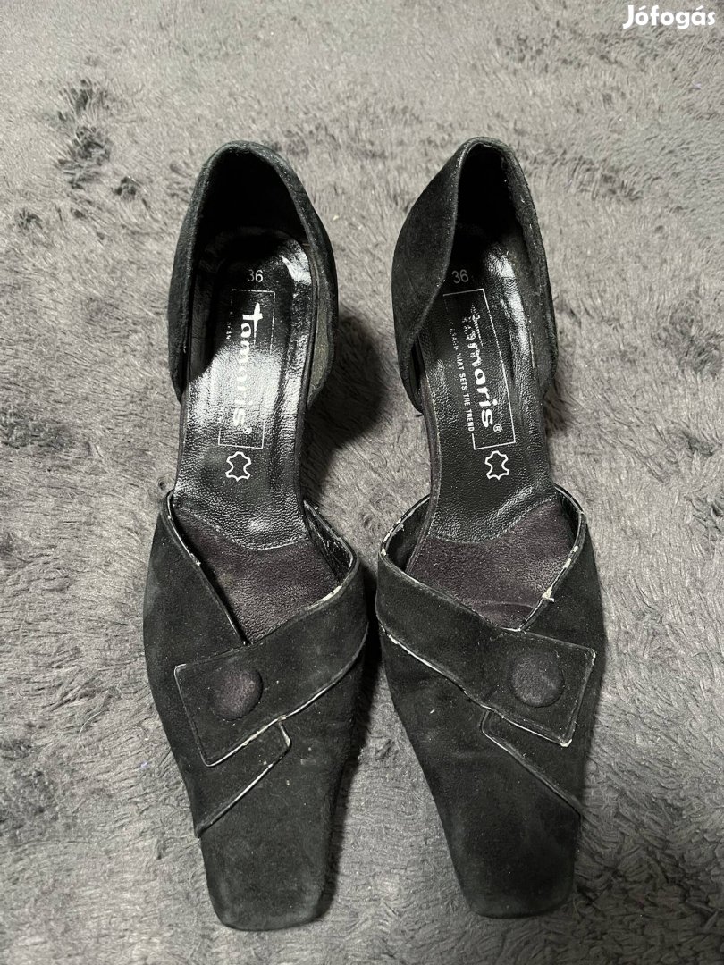 Elegáns, valódi bőr Tamaris cipő fekete velúrból, szögletes orral és dekoratív pánttal. Kényelmes kialakítás, stílusos részletekkel - tökéletes választás irodába, alkalmakra vagy hétköznapi viseletre. Kopásnyomok találhatóak rajta.