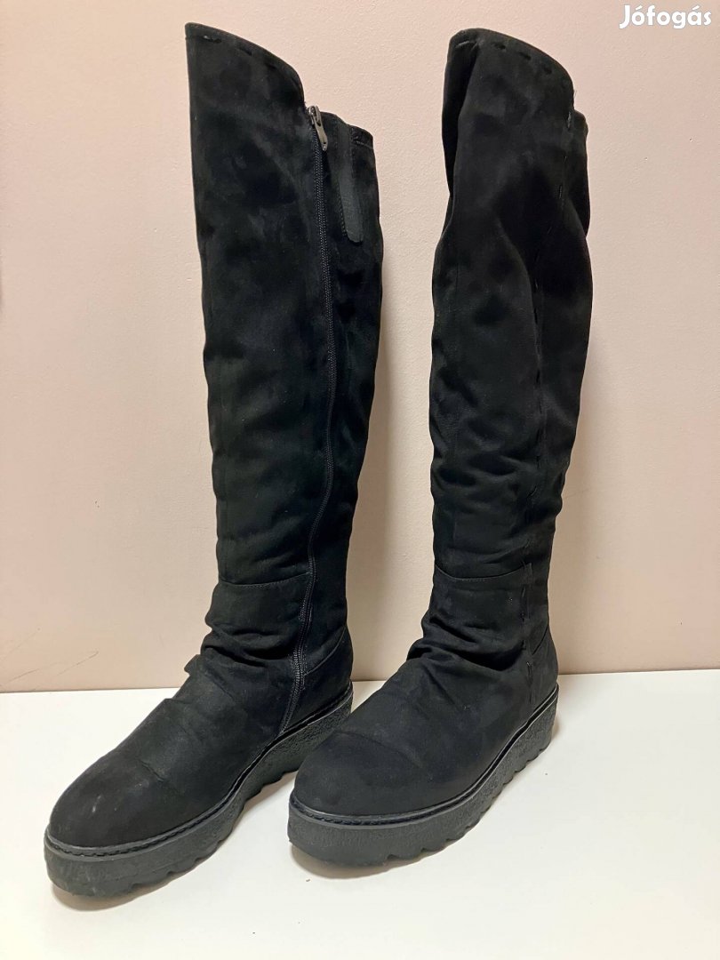 Keveset használt, újszerű állapotú Tamaris magas talpú velúr térdcsizma. Orr részen hajlításnál látni minimális használati nyomot, de nincs kiszakadva az anyag.