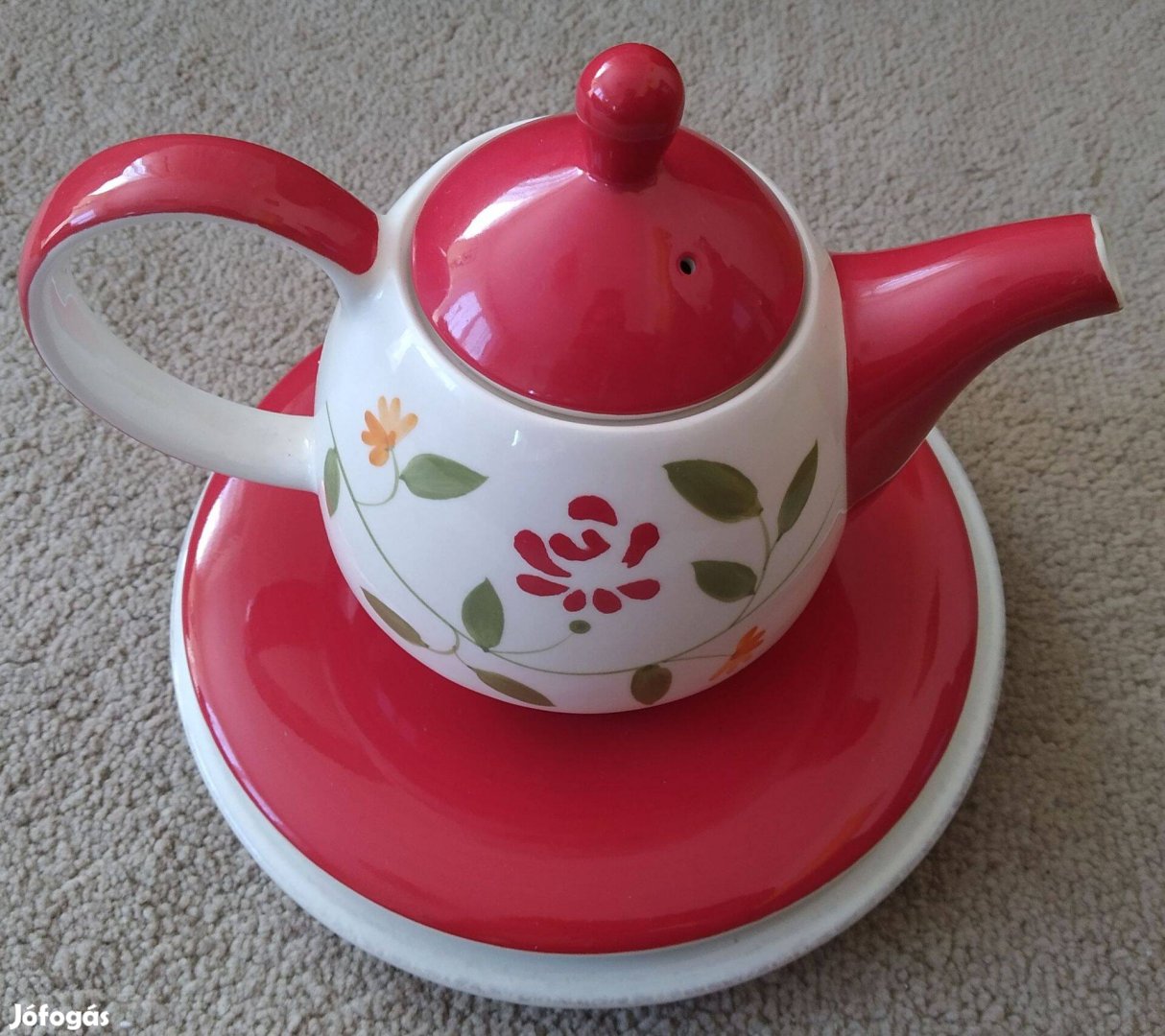 Eladó egy vadonatúj porcelán, úgynevezett teatorony : teáskanna, 2 talppal ( plusz egy csészével, ami ___nincs___ meg ehhez most. ) Piros-fehér színű, a két oldalán virágmintával. Nagy, jól megfogható füle van. Tartozik hozzá két "talp" is, két alj valójában, egyiket gondolom a kanna tetejére teszik, "toronyként", hogy a tea a csészében is melegen maradjon. De aki jobban tudja, írja meg :-) Az alsó, fehér tányér átmérője 19 cm, a pirosé 17, 5 cm. A kanna méretei : 14 cm magas és 19 cm széles a fogantyú és az orr között. A kanna alján a jelzés "Cha Cult" ( vagyis tea kultusz ) valamint, hogy kézzel festett finom porcelán, Made in Thailand. Ott van még a Hamburg szó is, gondolom a németek importálták. A fehér, alsó tányér alján más jelzés van : "TCM" vagyis Tchibo Certified Merchandise. Gondolom Tchibo promóciós termék volt.
