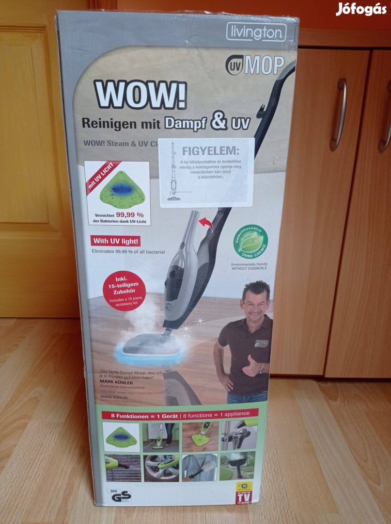Elvihető, vagy megrendelhető az originál, bontatlan Mediashop-os csomagolásban lévő új, multifunkciós Livington 8 az 1-ben UV Mop fekete/szürke színű, 1500W-os gőztisztító multifunkciós gép UV fénnyel, 300 ml-es tartállyal.