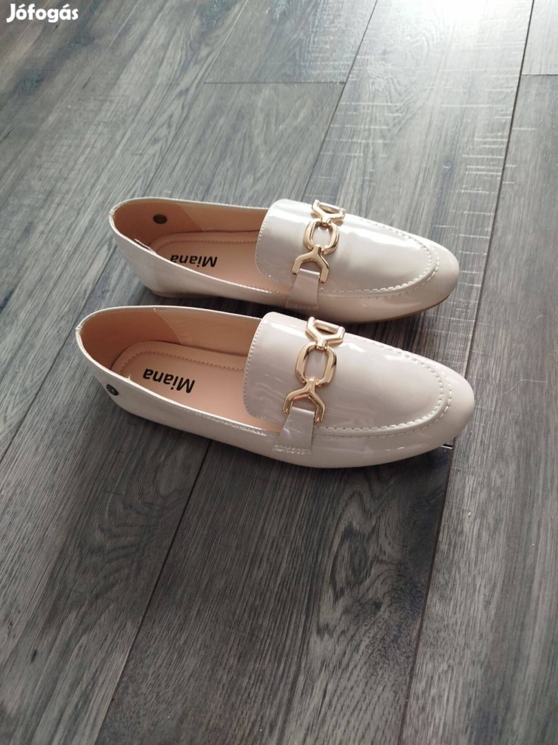 Eladó a képeken látható új női Miana márkájú mokaszin cipő.Mérete:39-es.Belső talpsz hossz:24.5 cm.Péren átvehető.Ár:6000 Ft.