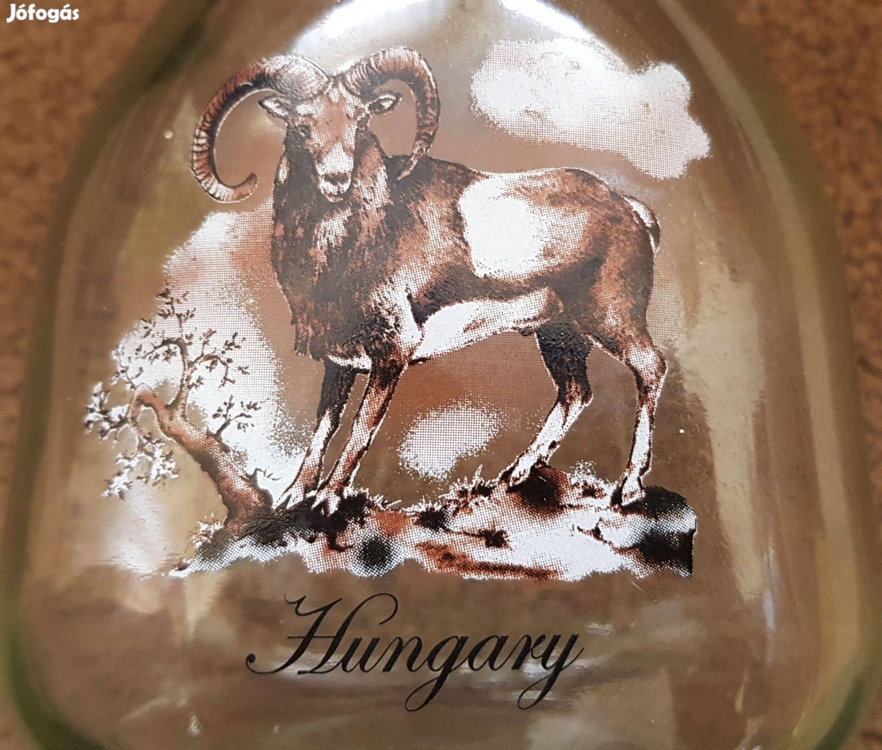Eladó egy gyönyörű, üveg dekanter ( kiöntő ) vagy dekor grasso. A talpán lévő jelzés szerint 0.75 liter űrtartalmú. Magassága ( dugóval ) : 32 cm, alul ~ 11 cm széles. Az egyik oldalán egy szép muflon ( kos ? ) képe látható, ez alatt pedig a "Hungary" felirat. A kép nem kézzel festett, de így is nagyon szép. A dugója is szép, csavaros üveg vagy akár kristály. Egy vadász vagy erdész számára nagyszerű, akár otthon vagy egy vadászházban, stb.