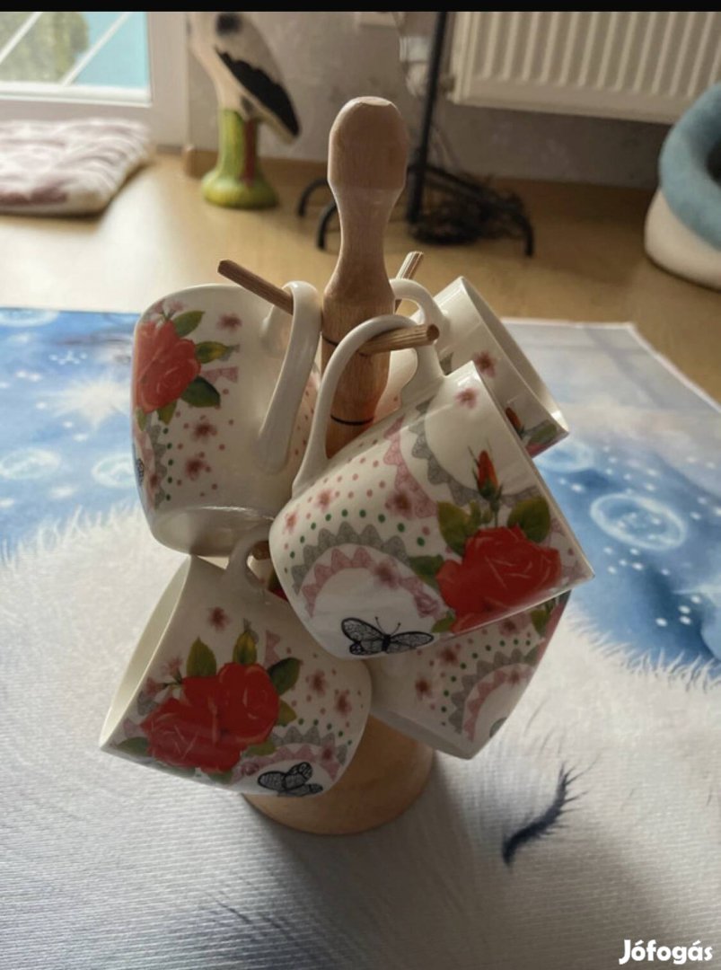 Vadonatúj bögrés szett 6 db + fa állvány dekor, ajándék, vintage stílus
