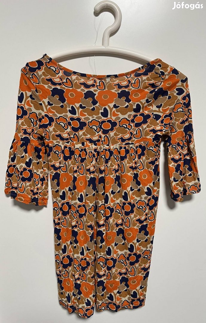 Rövid ujjú, puffos blúz narancs és sötétkék virágmintával. A nyaknál húzott rész finom redőzést ad az elejének. Kényelmes és nőies fazon, tökéletes tavaszi-nyári viselethez.