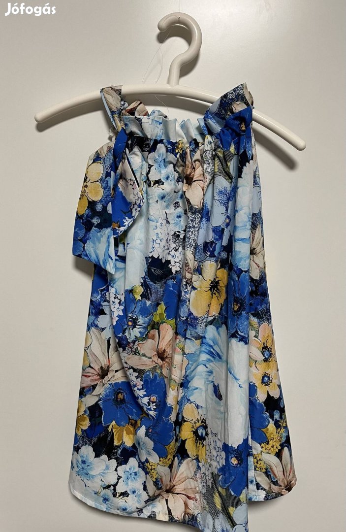 Színes, virágmintás ujjatlan nyári ruha gumis felsőrésszel és megkötős vállpántokkal. Kék, sárga, fehér és rózsaszín virágok élénk mintája, könnyű, légies anyag. Tökéletes választás meleg napokra vagy nyaraláshoz. Méret sajnos nincs feltüntetve a ruhán.