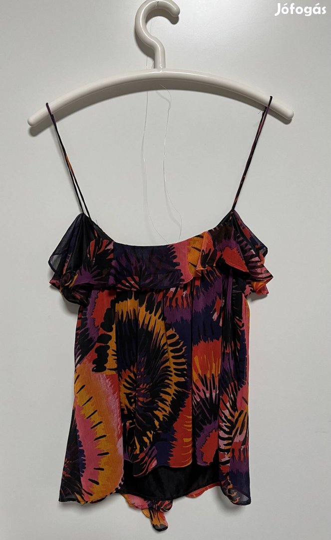 Könnyű, lenge nyári felső vékony pántokkal és élénk, absztrakt mintával (narancs, piros, lila és fekete árnyalatok). A nyakrész és az eleje fodrozott, ami nagyon nőies, légies hatást ad. Enyhén áttetsző, kellemes viselet meleg időben vagy akár rétegezve.