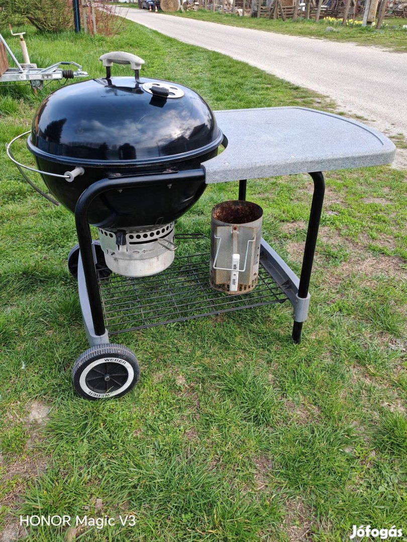 Eladó egy újszerű keveset használt minőségi Weber USA gyártmányú faszenes grill grillsütő grillkocsi masszív előkészítő asztallal. Nagyméretű 58 cm átmérőjű sütőrész, fotóztam nincs megégve az alja sem, megvan hozza a begyújtó kosár is. Személyesen is megvásárolható, telefonos megbeszélés után kérésre futárral is feladom.
