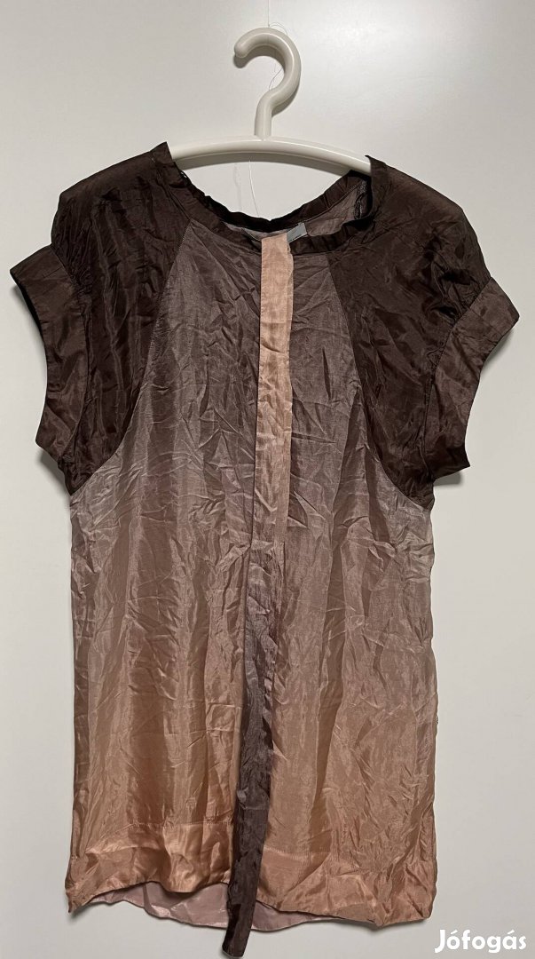 Könnyű, fényes anyagú rövid ujjú ruha sötét-világosbarna átmenettel. Kerek nyakkivágás laza szabás. Kényelmes viselet nyári napokra. Tartozik hozzá egy kötő is ahogy az a képen is látható.