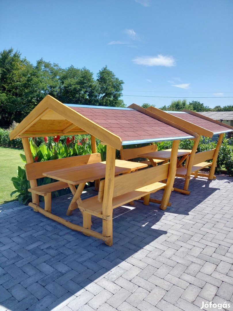 A tető és a padok egybeépítve, az asztal külön mozgatható.