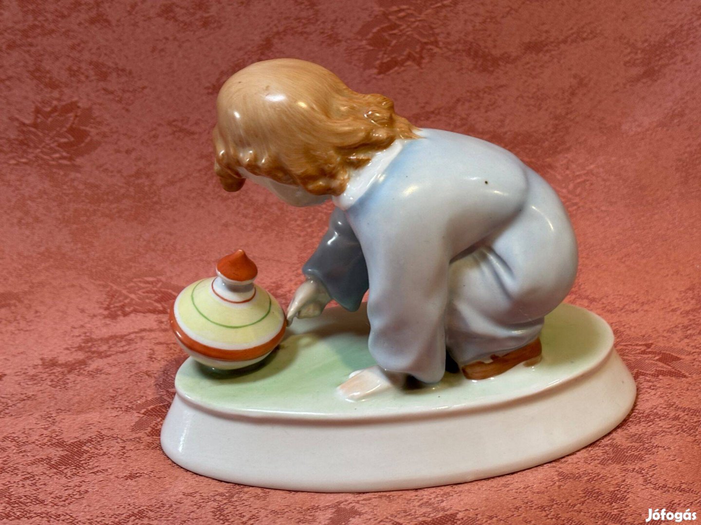 Zsolnay porcelán figura, dísztárgy, nipp, Búgócsigás gyerek