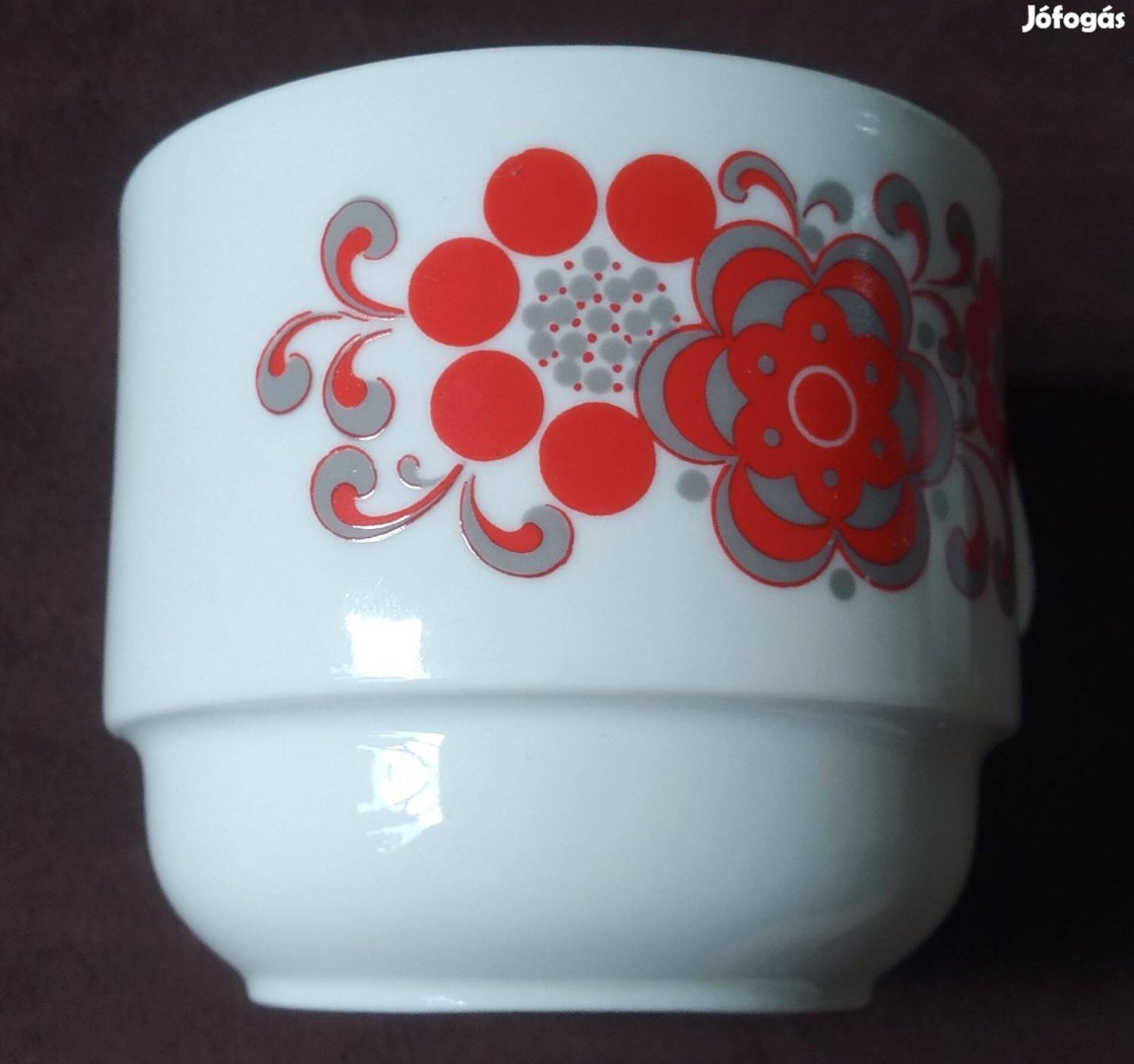 Eladó 4 db német porcelán kávéscsésze. Gyártó : Bareuther ( Waldsassen, Bajorország ). Jelzettek, a szokásos jelzés alatt még a 231-es szám szerepel ( ha jól látom ). Azonkívül még a porcelán anyagába 2 szám van nyomva : az "51" és a "4732", bármit is jelentsenek ezek. A csészék mind jó állapotban vannak, hibátlanok. A méreteik : 6.5 cm magas és 7.5 cm széles. Csak az egyik oldalon van minta rajtuk, stilizált virágok, piros és szürke színekben. Tartozik hozzájuk aljak is, szép fehérek, minta nélkül ( ezekből 5 db van. ) Valamint van egy kis cukortartó is, 7 x 9 cm. Alkalmasak készletek pótlására vagy gyűjtőknek...
