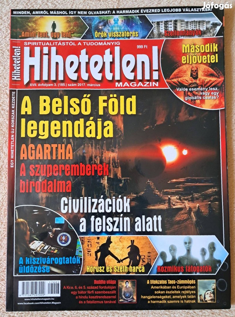 Eladó egy nagyon újszerű magazin. A címe : Hihetetlen ! Kiadás : 2017 március. 112 oldal. Kiadási azonosító : HU-ISSN 1587 5970 . Jó minőségű, fényes papíron. Hiányzó példány pótlására is, de kiváló olvasmány így magában is...