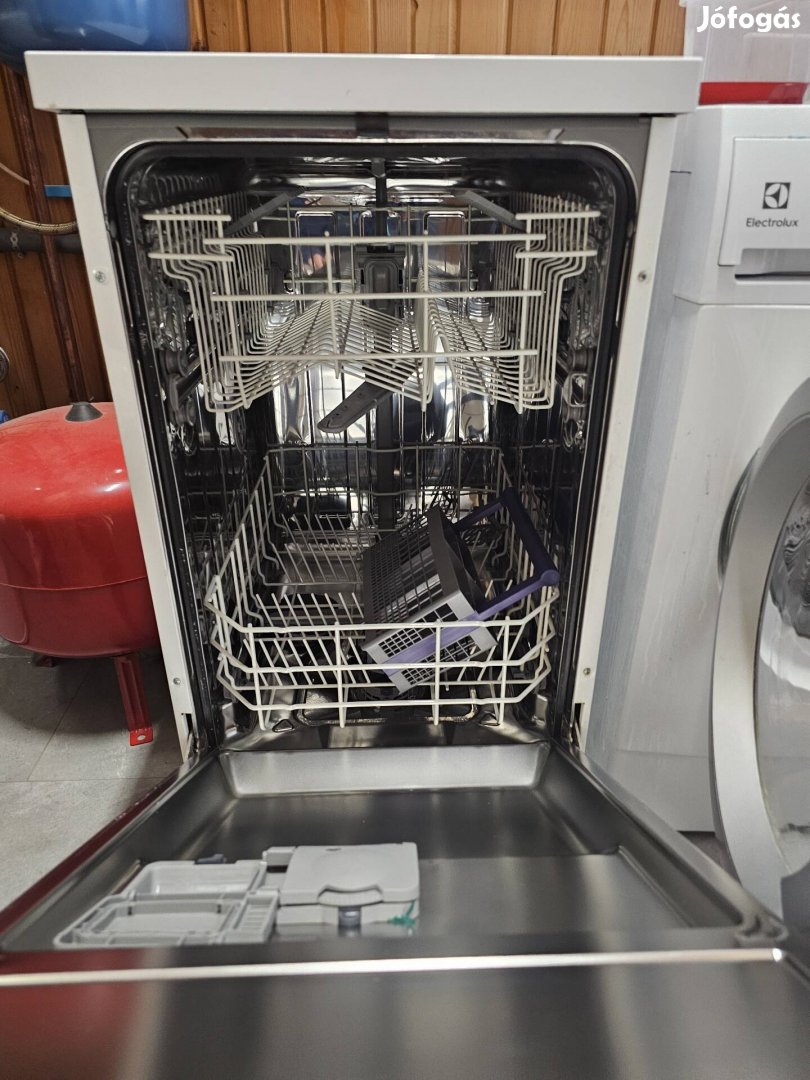 A képen egy Beko DFS05011W (vagy azzal megegyező külsejű DFS05010W) típusú, keskeny (45 cm széles), szabadonálló mosogatógép látható. Ez egy alapmodell, amely 10 terítékes, és mechanikus (tekerőgombos) vezérlésű.