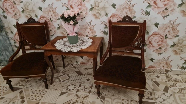 Antik ónémet (neoreneszánsz) faragott karoszékek+asztalka
