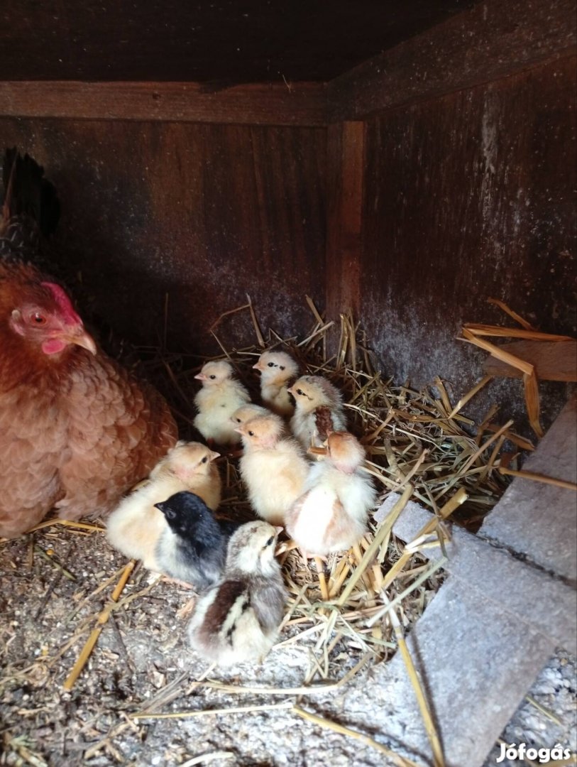 Eladó japan és keverék csibek 10 db van. (5 kopasz nyakú 5 sima valószínűleg sárga, fekete és fehér színben) ár 250 Ft/db