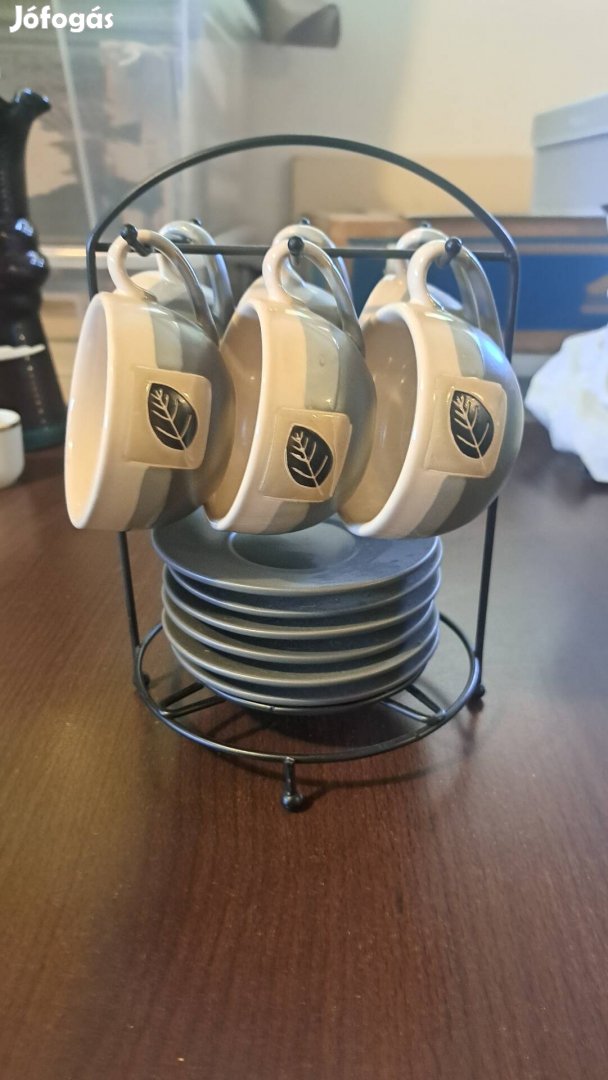 6 darabos újszerű kávéskészlet tartóval együtt