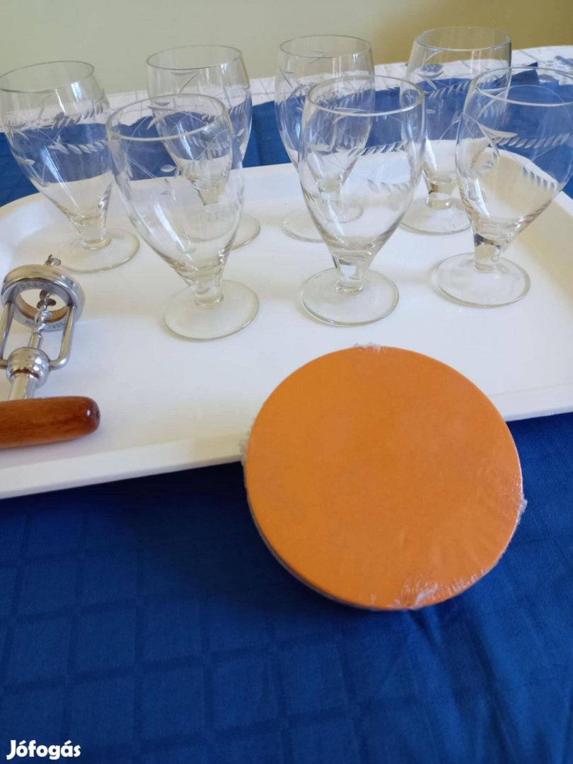 7 db talpas csiszolt pohár, dugóhúzó és 10 db papír pohár alátét olcsón elvihető. Nem postázom!