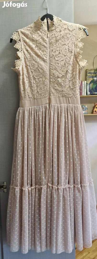 Midi fazon, klasszikus és kifinomult megjelenes, pöttyös tüll szoknyarész, légies romantikus hatás, csipkés felsőrész és fodros ujj, elegáns kidolgozás, derékban szabott fazon, mely kiemeli az alakot, pamut alsószoknya két réteg tüll borítással, a szatén masni a ruha része. Egyetlenegy alkalommal viselt.