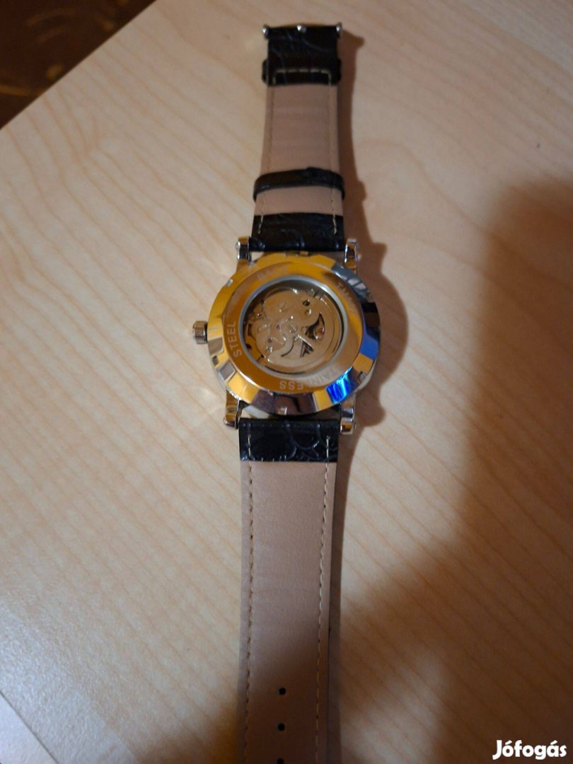 Műanyag bőrhatású szíjjal, valódi automata szerkezettel. Egy probléma van vele, hogy gyakran ellenőrízni kell a pontosságát, persze az ára kompenzája ezt.