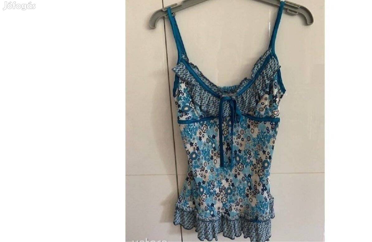 Eladó a képen látható Bay vékony spagetti pántos kék mintás újszerű felső S. Állítható a pánt, hátul gumis, felül csipkével díszített, az alja bővül és fodros. Anyag: 100% polyester. Kérdésekre szívesen válaszolok, csere nem érdekel, árut vissza nem veszek. A posta költség a vevőt terheli.