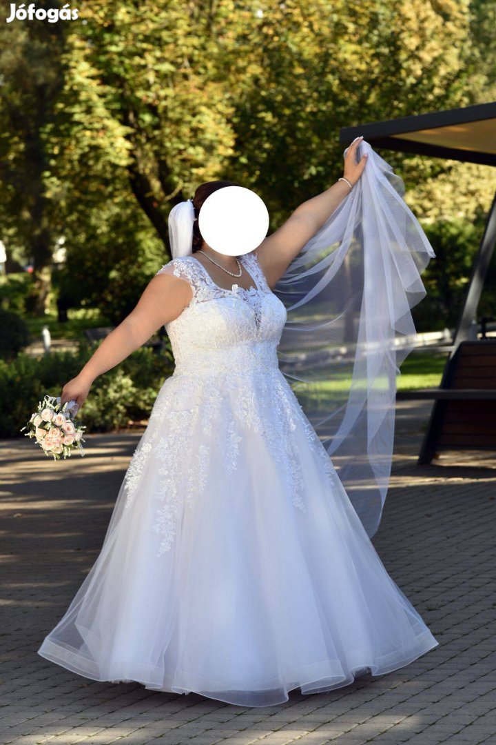Összesen egy alkalommal volt rajtam (esküvő + fotózás), szakszerűen tisztítva, hibátlan, szakadás- és foltmentes állapotban, ruhazsákban tárolva.