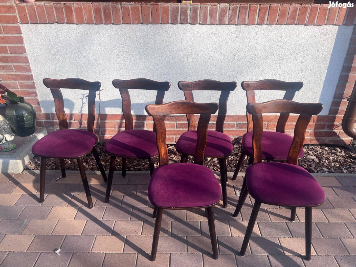 Eladó a képeken látható, 6 darabból álló antik jellegű étkezőszék garnitúra. A székek a klasszikus Biedermeier formavilágot idézik, elegáns hajlított háttámlával és sötétre pácolt fa vázzal rendelkeznek.