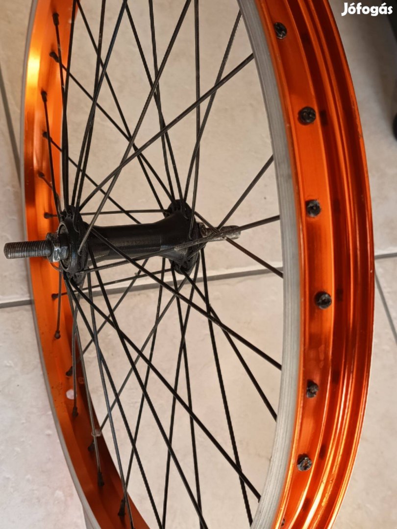 Camping, BMX 20 -as Orange első kerék jó állapotban eladó. Nagyon szép dizájn. Narancs színű alufelni, fekete küllők. Jó minőségű kerék, de nem tudom milyen gyártmány mivel csak a matrica helye látszik. Nem üt, a küllők is feszesek. Mivel ezer éve őrizgetem használat előtt egy átnézés, zsírzás ráfér.