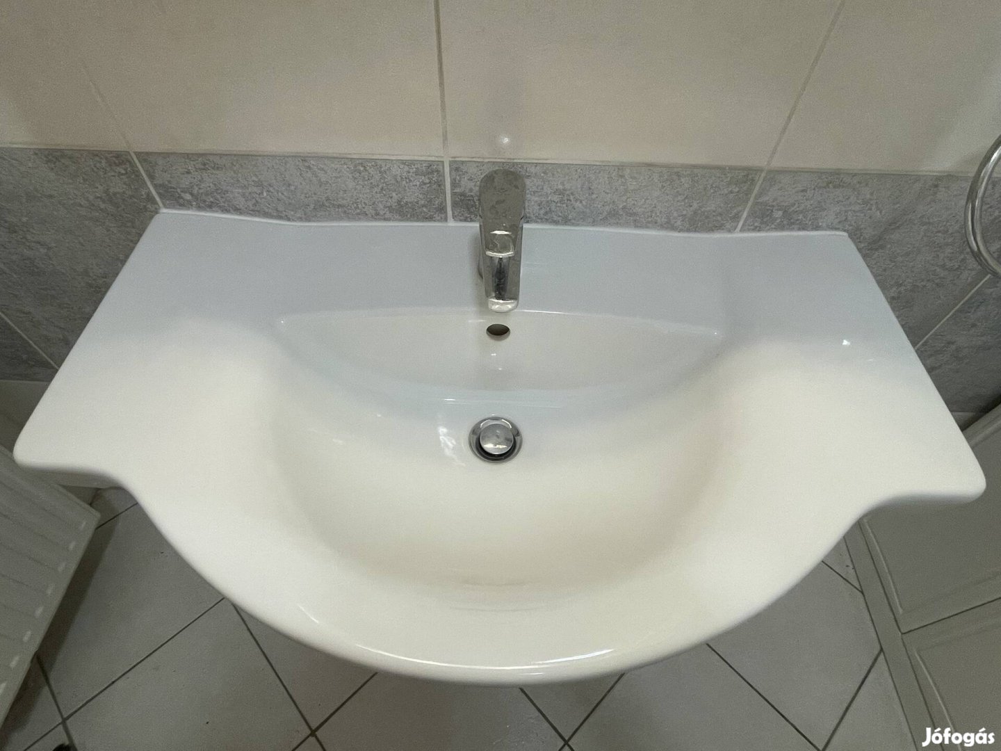 Hajdúszoboszlón szép állapotú használt Cersanit Libra 80 mosdókagyló (82x47 befoglaló méretű) egykaros Mofém csapteleppel és design csőszifonnal.