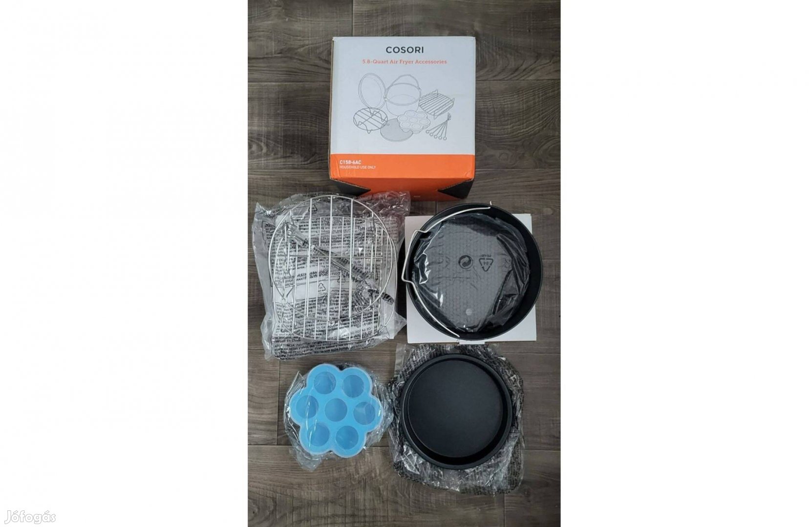 Eladó egy teljesen új Cosori légkeveréses fritőz tartozék, 6 darabos készlet. Cosori 5.8Qt légkeveréses fritőzökhöz (CP158-AF, CP358-AF, CO158AF) is alkalmas, nagyobb légkeveréses fritőzökhöz is alkalmas, Gowise USA, Philips, Ninja, Instant Pot és a legtöbb légkeveréses fritőz márkához használható. 6 darabos kiegészítőkészlet : tartalmaz 1 db tortaformát; 1 db pizzaformát; 1 db fém tartót; 1 db többcélú rácsot 5 nyárssal; 1 db szilikon alátétet; és 1 db tojássütő formát fedővel. Egészséges és biztonságos, élelmiszeripari minőségű és hőálló anyagokból készült kiegészítők FDA-kompatibilisek és BPA-mentesek. Minden tartozék mosogatógépben mosható. Tapadásmentes bevonatú serpenyők, fémrács és hőálló alátét és forma, amelyek tartósak és könnyen tisztíthatók. Ajándéknak is kiváló! Átvehető személyesen Debrecenben, Berettyóújfaluban vagy Balmazújvárosben, illetve postázom is.