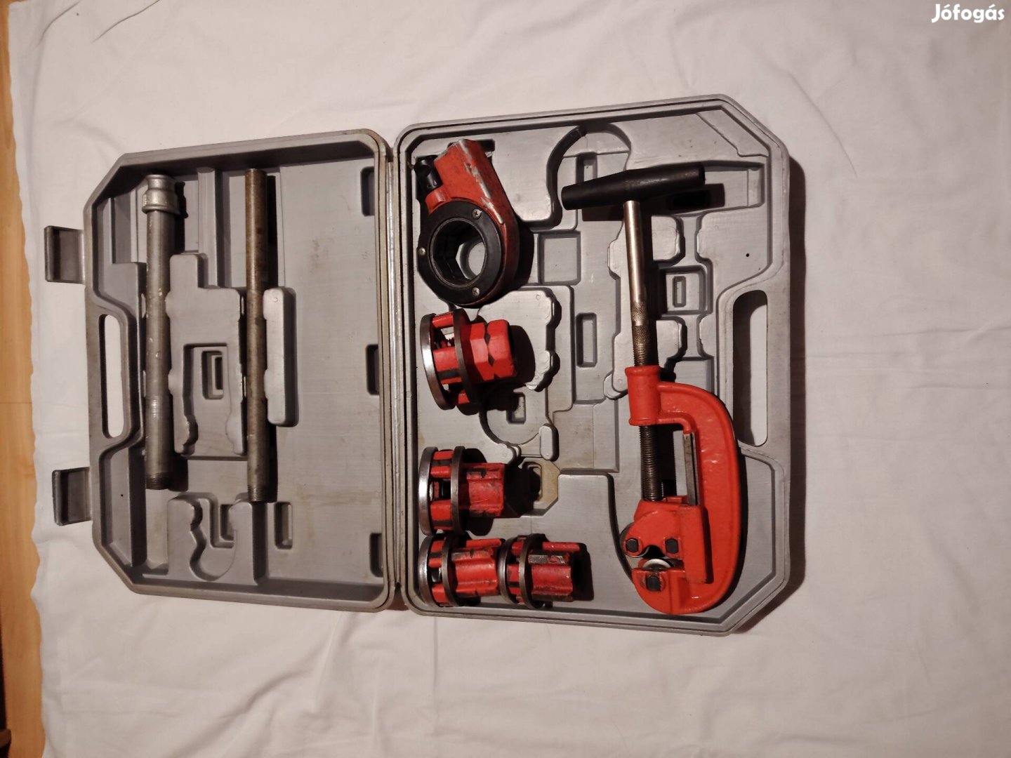 Csőmenetmetsző 1/2", 3/4", 1", 5/4" menetvágó fejekkel. A nyele csőből van csinálva, egykéses csővágó 1/2" - 2"-ig vág.