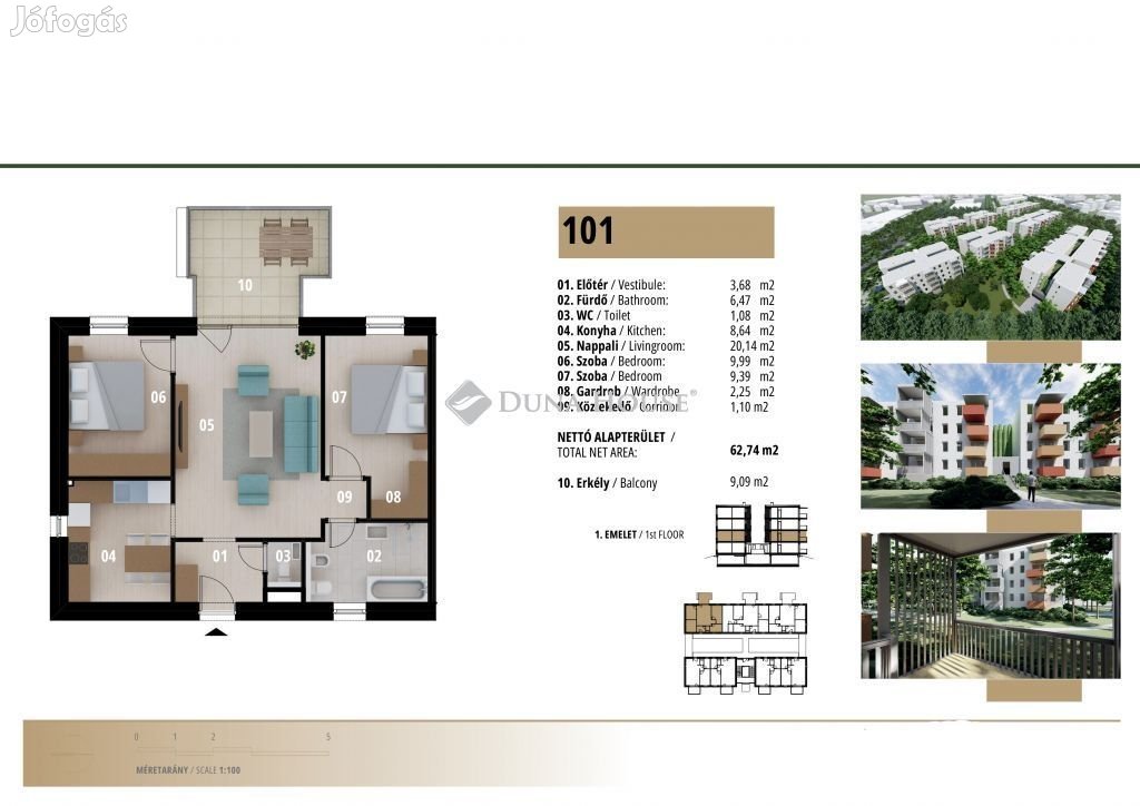 Az első emeleten 64 nm-es, nappali + 2 szobás, K-i tájolású, erkélyes lakás megvásárolható.BÚTOROZZA BE LAKÁSÁT ÁLLAMI TÁMOGATÁSBÓL ! VÁSÁROLJON NÁLUNK, ÉS IGÉNYELJE VISSZA A LAKÁS VÉTELÁRÁNAK 5%-át!Egyedül álló lehetőség Debrecenben! Már költözhető, modern, fiatalos, gépesített konyhabútorral beépített lakások egy karnyújtásnyira a belvárostól!A beruházás I. ütemeként megépült épület 28 lakását kínáljuk megvételre Debrecen jelenleg egyetlen olyan projektjében, ahol visszaigényelheti a lakás vételárának 5%-át!A több éves tapasztalattal rendelkező beruházói és kivitelezői csapat megfelelő referenciákkal és szakértelemmel valósította meg a projektet.Céljuk egy fiatalos, modern gépészeti megoldásokkal, élhető alaprajzi elrendezéssel rendelkező épület megépítése volt, éppen ezért jellemzően nappali+ 1 hálós és nappali + 2 hálós lakásokat találhatunk az épületben, de természetesen a több fős családok számára is van választási lehetőség.A modern stílusú, esztétikus homlokzat mögött harmonikus, napos, erkélyes otthonok várják az új lakókat.Az eladó lakások alapterülete 42 és 80 nm közötti, így mindenki megtalálhatja a maga számára optimális életteret.Főbb paraméterek:- modern, gépesített magasfényű konyhabútor- hőszivattyús padlófűtés- hűtés: split klímaberendezéssel- 3 rétegű üvegezéssel ellátott nyílászárók- minőségi burkolatok- erkély- stb.:Felkeltettem érdeklődését! Hívjon, akár hétvégén is! Tekintse meg a helyszínen a lakásokat!