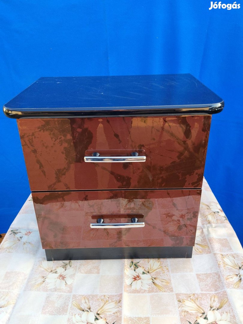 Eladó egy magasfényű bútorlapból készült két fiókos, krómozott fogantyús éjjeli szekrény.