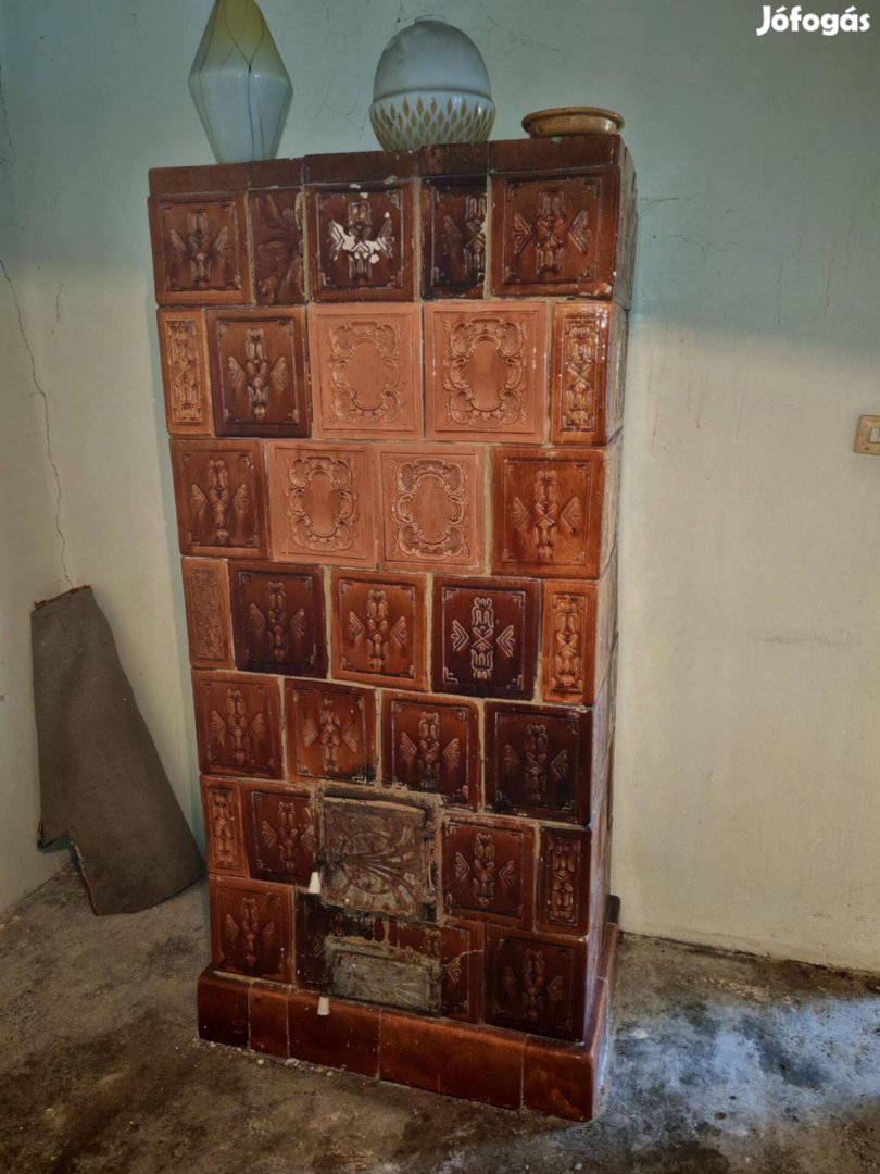 Eladó egy barna csempés, hagyományos álló cserépkályha.