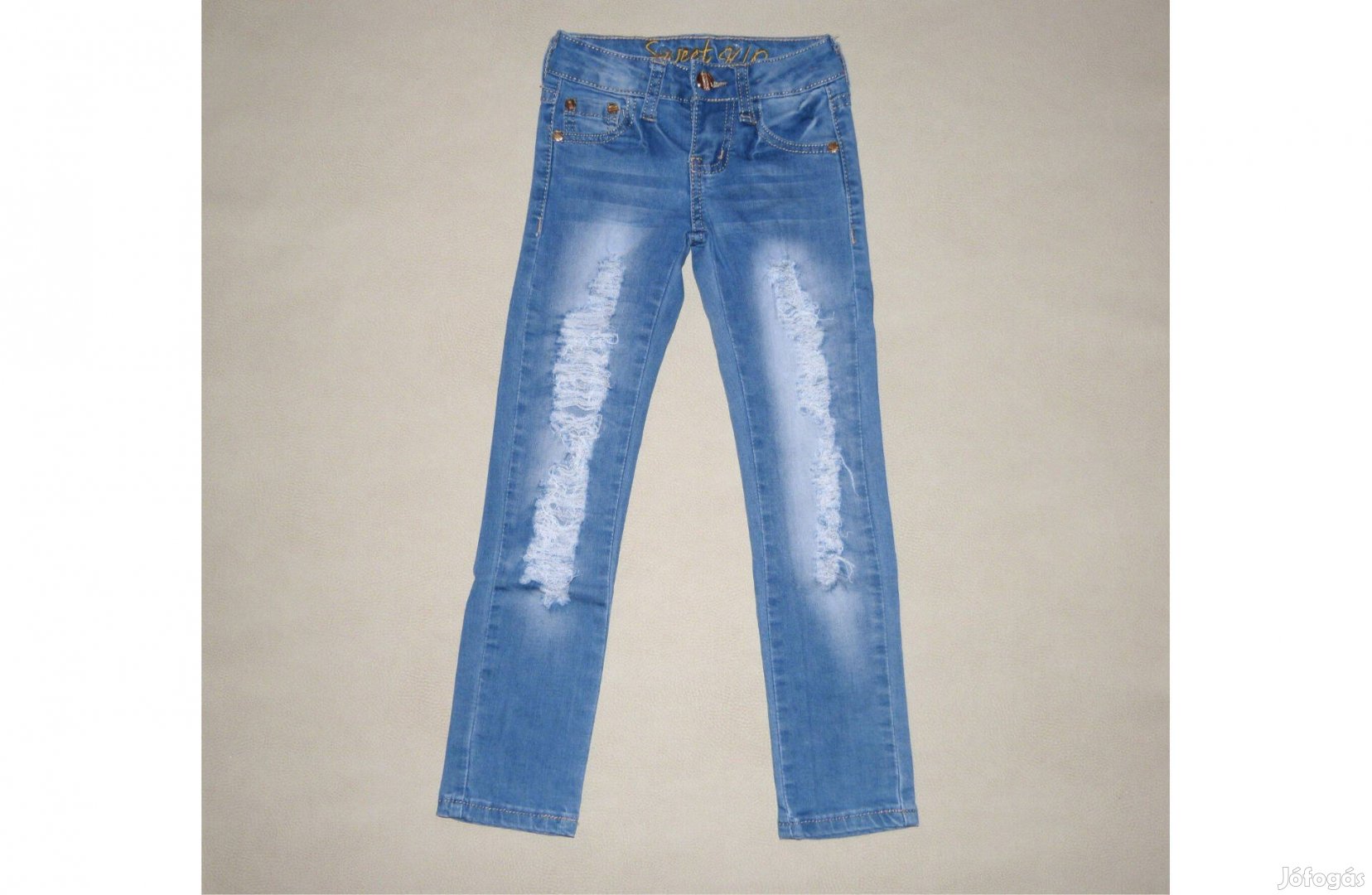 Kiváló állapotú! Hossza: 68 cm, belső szárhossza: 51 cm, derékbősége: 46-56 cm, beleírt mérete: 8 év, de 122-es méretnek felel meg, lásd az adatait