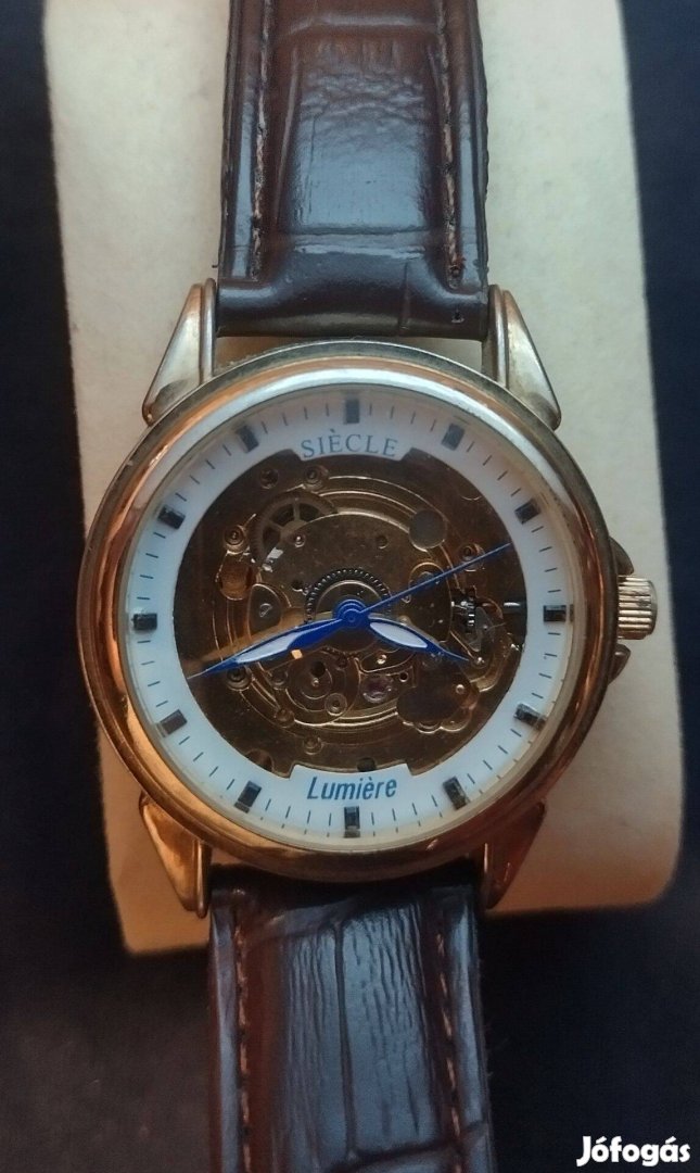 Eladó egy látványos megjelenésű, Siécle Lumiére márkájú automata karóra. Az óra szkeleton kialakítású, így a szerkezet működése elölről és a hátlapon keresztül is megfigyelhető.