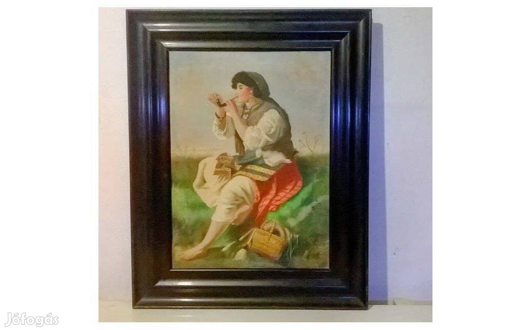 Vastagh György Pipára gyújtó cigánylány c. alkotásának egyik olajvászon másolata, "Gomány J" szignóval, üvegezve, politúros bíder kerettel (kb. 58x74 cm).
