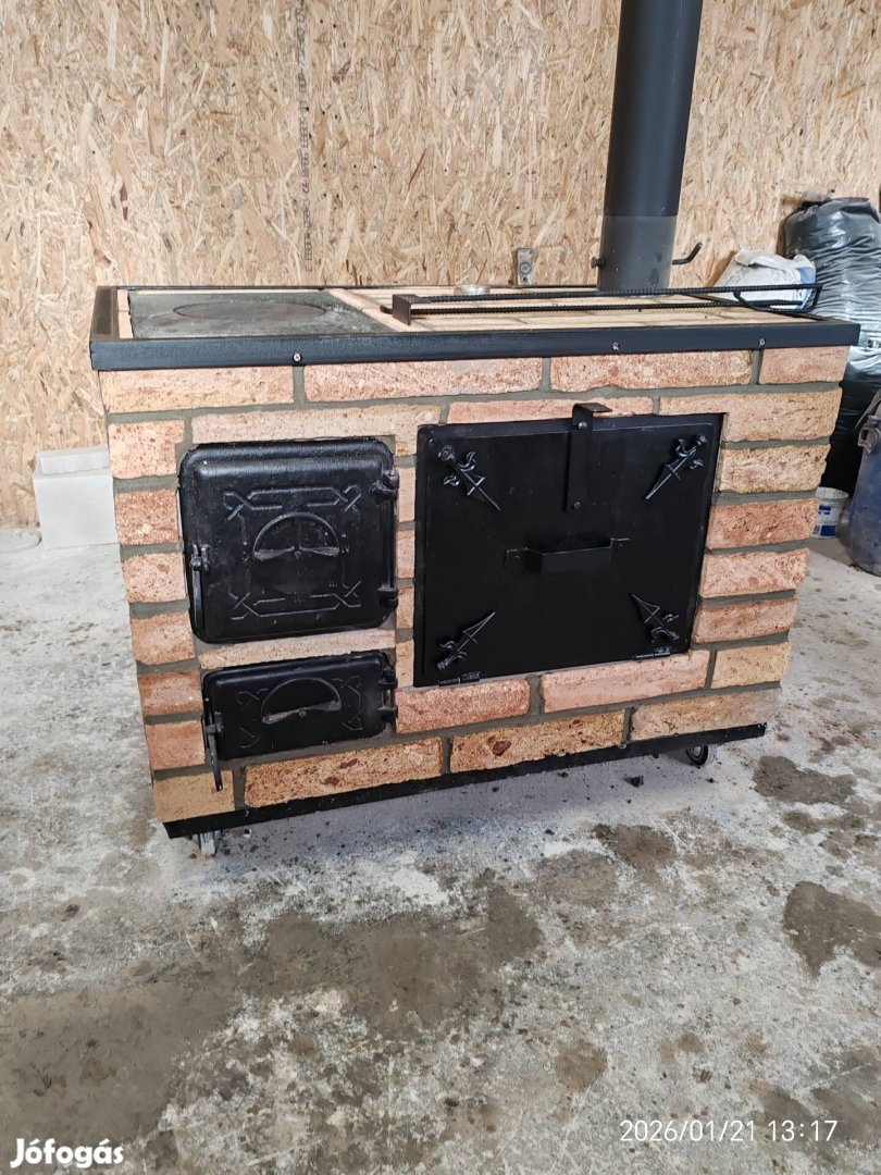 Üdv Eladó rendelhető saját készítésű épített sparhelt sütőtérrel, 100x60-as alpterületü, ipari gurúlós kereken, samot béléselt, 500fokos hőmérő huzatszabályzós kémény tepsirács hamu kikaparó és piszkavas amit tartalmaz. Akár egyedi méretben és elképzelés alapján is kérhető.