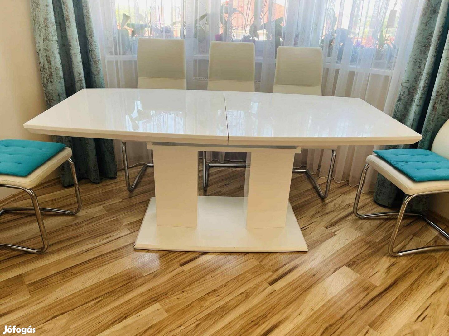 Eladó a képen látható étkező asztal, kisebb, apró hibákkal. 90 cm széles, 180 cm hosszú, de meglehet hosszabbítani a képen látható résszel + 60 cm-rel, így lesz 240 cm hosszú. Erős, masszív szerkezetű. Táncolni is lehet rajta, de nem ajánlott.