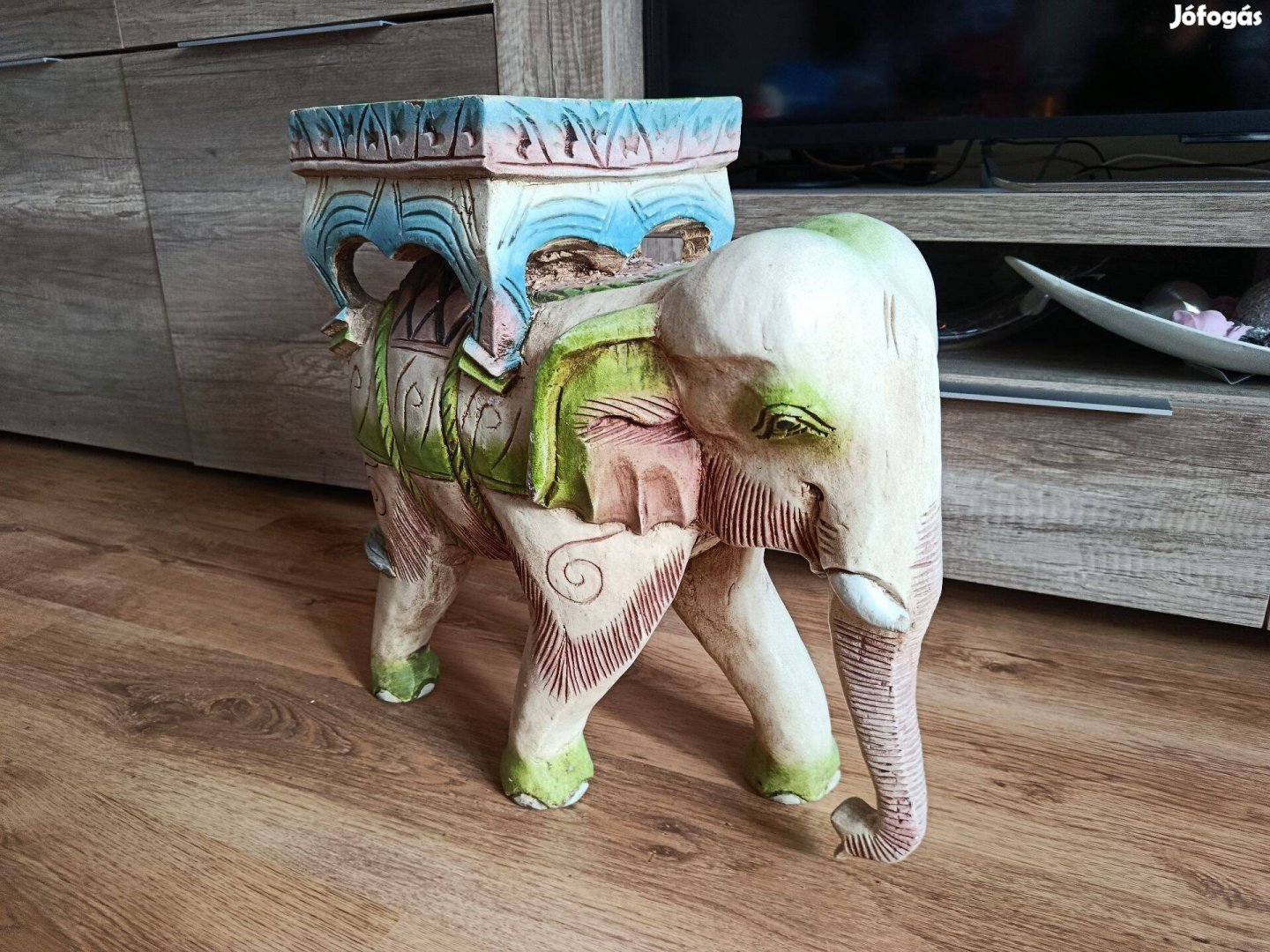Képek szerinti külföldről érkezett fából készült elefánt használt, jó állapotban eladó. Használati nyomok vannak....közeli fotókon jól látható az állapota. kb 48x48x22cm. 13kg.!