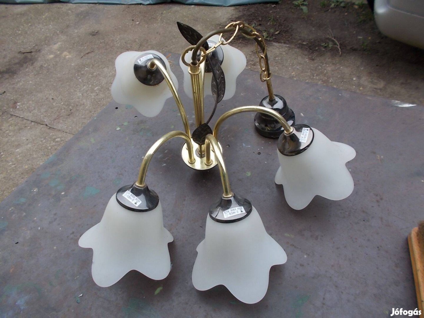 fém réz szinű mennyezeti lámpa csillár szép állapotban 5 ágú üveg búrákkal