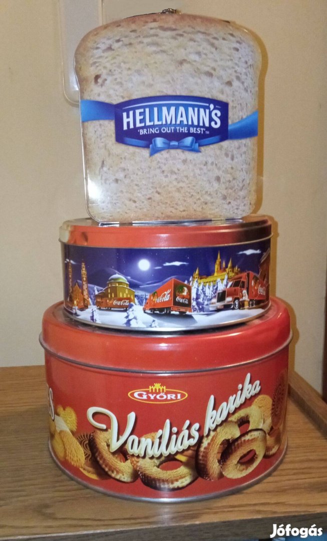 2 db kör alakú fémdoboz és 1 db kisebb uzsonnás doboz.