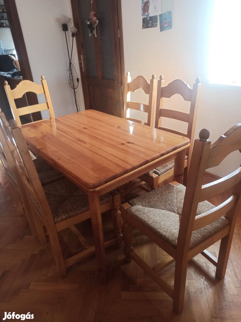 Fenyő étkező asztal, 120*80, bővíthető, masszív, apróbb, használatból eredő felületi szépséghibákkal. Van hozzá 6db szék, masszív, faragott lábakkal és háttámlával.