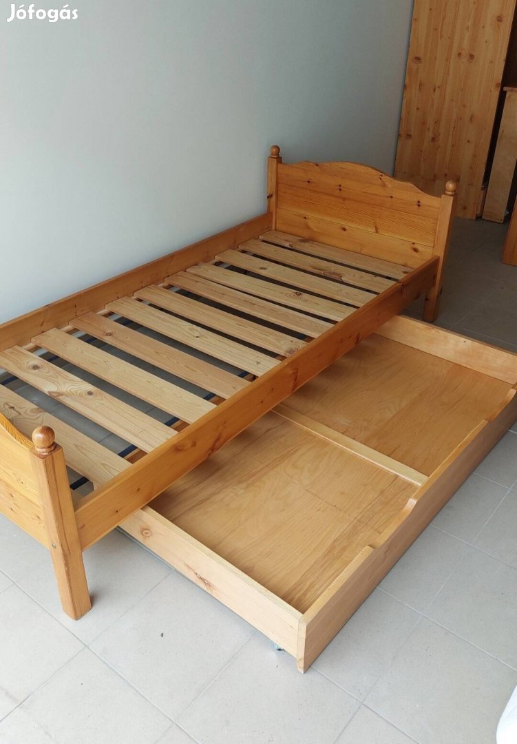 Jó állapotó masszív fenyőfa ágy ráccsal, igény szerint 90x200 matraccal eladó. Az ágynemű tartó más típusú bútorcsaládhoz tartozik, de színben közel azonos a fenyőhöz. Minimálisan alkuképes. A matrac és az ágyneműtartó ára 5-5 ezer Ft. Ugyan itt még egy fenyőfa szekrény és fenyőfa íróasztal eladó.