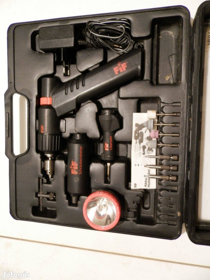 Eladó egy akkus készlet hobby célokra a képen látható tartozékokkal,az akku frissen cserélve.Tartozék: két fokozatú fúrógép,irány váltós csavar behajtó (kézzel nem lehet megfogni),lámpa (erős fénye van),forrasztó páka (hamar melegszik és kisebb dolgok forrasztására tökéletes),töltő.Évek óta használom,alkalom szerűen,hibátlanul működik,az akku töltése kicsit több idő.