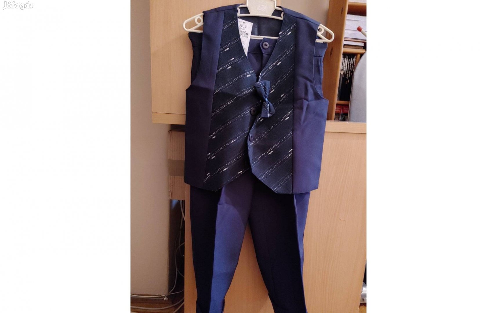 Eladó a képen látható 122-128 méretű sötétkék mellény-nadrág-nyakkendő.