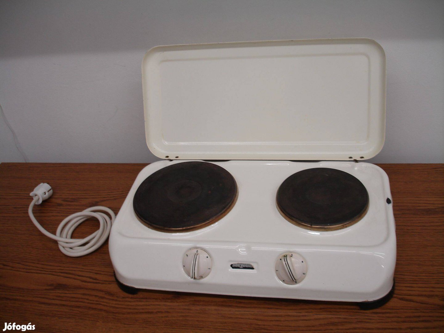 Egy igazi korabeli, kétlapos elektromos rezsó, ami még abból az időből való, amikor az anyag nem spórolás kérdése volt. Súlya is van, tartása is van nem a mai leheletkönnyű kategória.