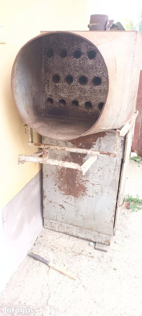 Eladó a képen látható légbefújós fűrészporos kazán, 100l töltő hordóval.