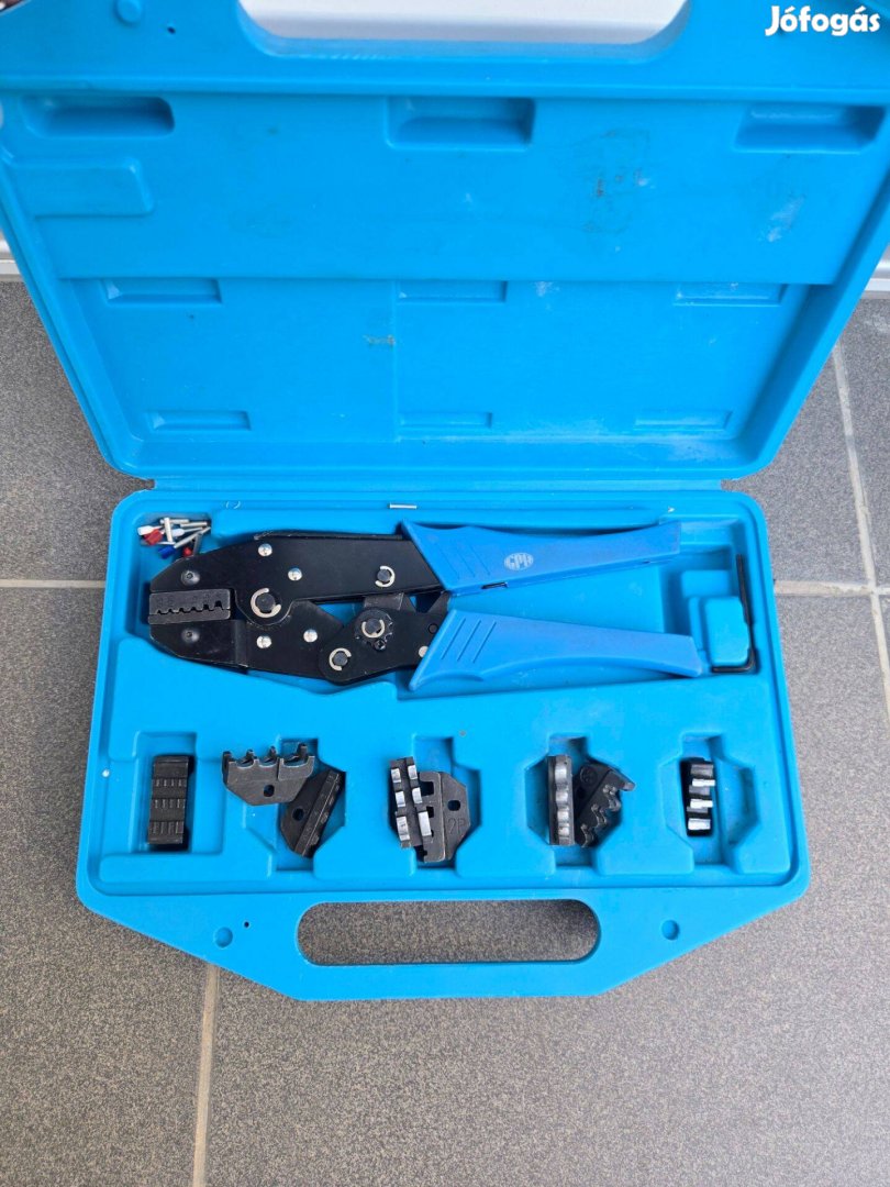 Tartozékok: Krimpelő fogó + 5 pár különböző méretű/típusú cserélhető préspofa (érvéghüvelyekhez, kábelsarukhoz).