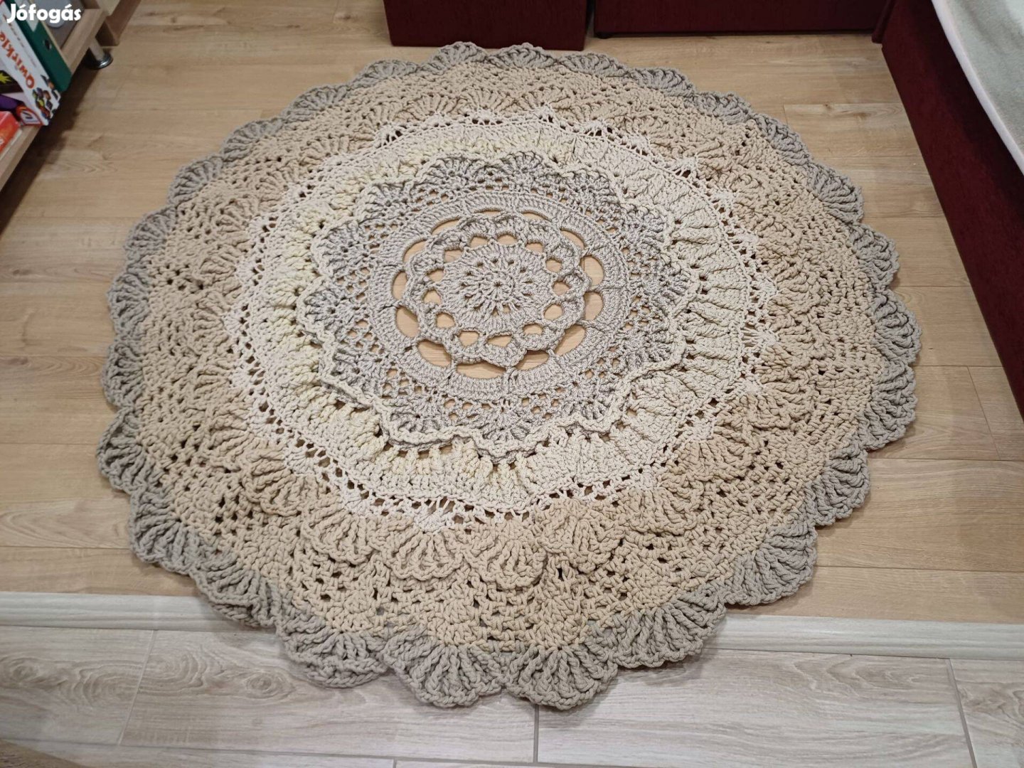 Kerek kézi horgolású pamutszőnyeg eladó. Átmérője 155 cm. 5mm-es pamutzsinorból készült.