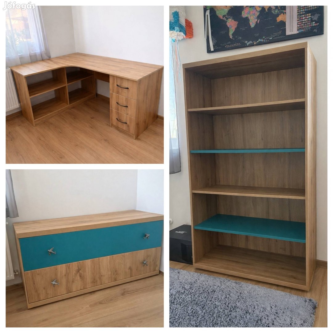 Eladóvá vált a képeken látható, megkímélt állapotú, egységes stílusú ifjúsági bútorgarnitúra. Ideális választás gyerekszobába vagy tanulósarokba.
